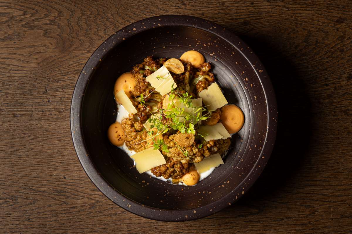ABYA acaba de inaugurar nueva temporada con tres propuestas gastronómicas: el chipirón de anzuelo con vichyssoise, emulsión de cebollino y su tinta, la tortilla abierta de huevos camperos, caviar y gamba roja y la coliflor china con yogur y hummus de alubia blanca. “Soy un apasionado de la comida oriental, y me encanta sumergirme en Usera, conocido popularmente como el barrio chino y fue allí donde probé este vegetal (coliflor) diferente en sabor y textura, y decidí introducirlo en la propuesta”, cuenta a Vozpópuli.